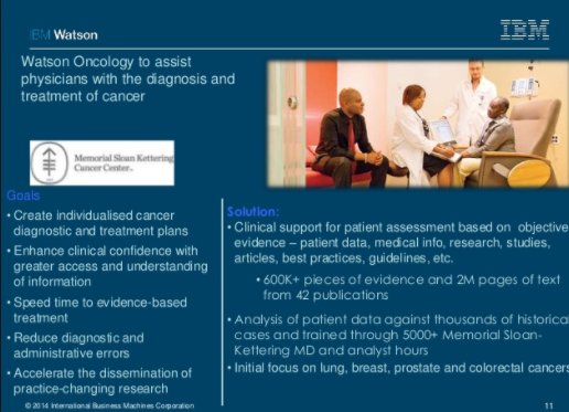 Watson for Oncology está siendo entrenado por oncólogos del centro Memorial Sloan Kettering de Nueva York. Se trata de un sistema de computación cognitiva que utiliza el procesamiento del lenguaje natural para asimilar datos estructurados y no estructurados sobre los pacientes. Esta tecnología proporciona a los profesionales médicos distintas opciones de tratamiento para su consideración. Estas recomendaciones proceden de normas, documentación sanitaria y experiencia adquirida de otros casos con pacientes.