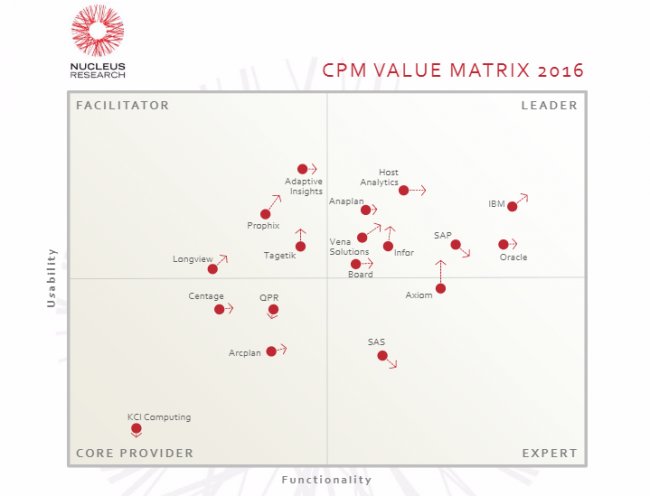 Publicamos listado y comentario de los principales software CPM (Corporate Performance Management) en informe publicado en marzo de 2016 por la consultora Nucleus Research titulado «CPM Technology Value Matrix 2016».