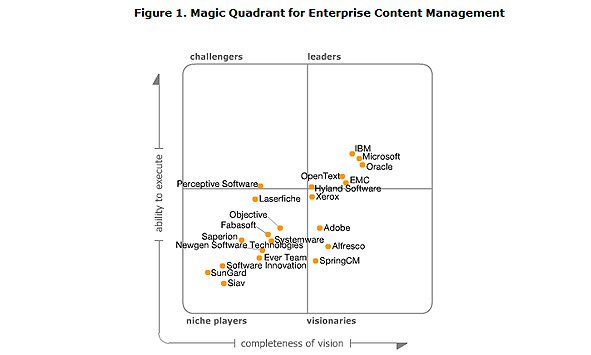 Este Cuadrante Mágico muestra la situación del mercado ECM en 2011. Gartner recomienda a los lectores no comparar la posición de los diferentes vendedores con la situación de años anteriores, ya que este mercado está cambiando con nuevas adquisiciones y alianzas, desarrollos de soluciones y la aparición de modelos alternativos, haciendo así que los criterios de selección y clasificación de los vendedores hayan evolucionando .