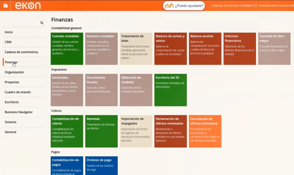 El módulo de finanzas forma parte de la suite integral de gestión de ekon y, según se comenta en el video, puede integrarse con aplicaciones de tercero como por ejemplo el CRM de Siebel o otros ERPs cómo el SAP R/3.