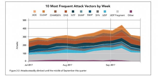 Quizá más alarmante aún fue lo que se descubrió al examinar más de cerca la botnet Mirai y detectar un nuevo malware: WireX. Si bien de menor alcance que su predecesor, la cepa del malware Mirai, que utiliza dispositivos del Internet de las cosas, fue responsable del mayor ataque visto en el tercer trimestre en el rango de 109 Gbps. La continua actividad de Mirai junto con la introducción de WireX, que controla dispositivos Android, no hace más que resaltar el enorme potencial que supone el panorama actual para los nuevos ejércitos de botnets.