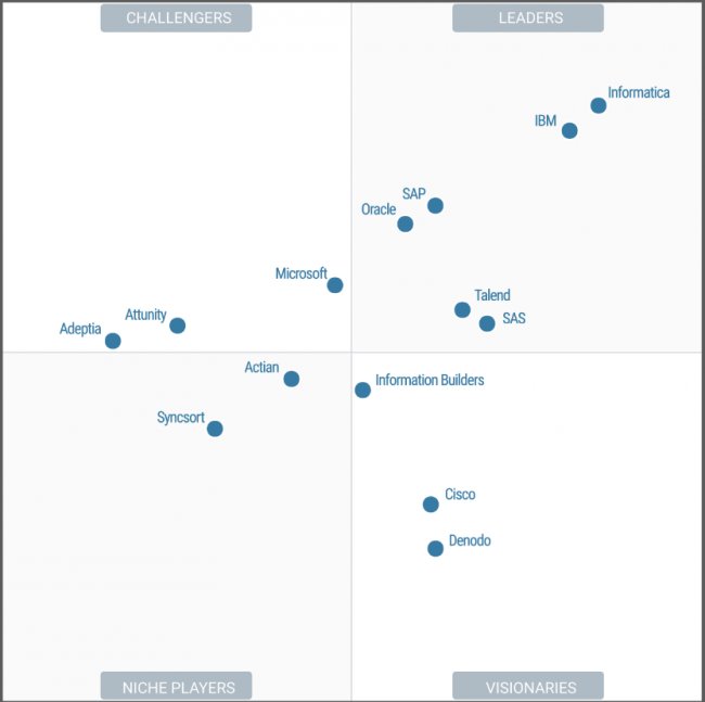 Denodo, fabricante de virtualización de datos patrocinador de este Magic Quadrant, ha pasado a ser un visionario en el cuadrante por su planteamiento de integrar datos sin necesidad de mover físicamente los datos de un repositorio a otro, con lo que las empresas ganan agilidad en la integración de los mismos y minimizan sus costes. Esto tiene un alto impacto en necesidades análiticas en tiempo real, integración cloud y proyectos Big Data.