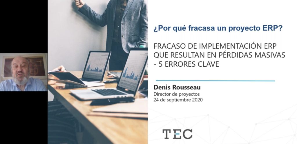 Publicamos grabación del seminario web “¿Por qué fracasa un proyecto ERP?, impartido por Dennis Rousseau, Director en Proyectos en TEC, el 24 de septiembre de 2020. Durante el webinar, de una 1 hora de duración, Rousseau explicó las cinco razones más importantes por las que las implementaciones de software de ERP fallan repetidamente.